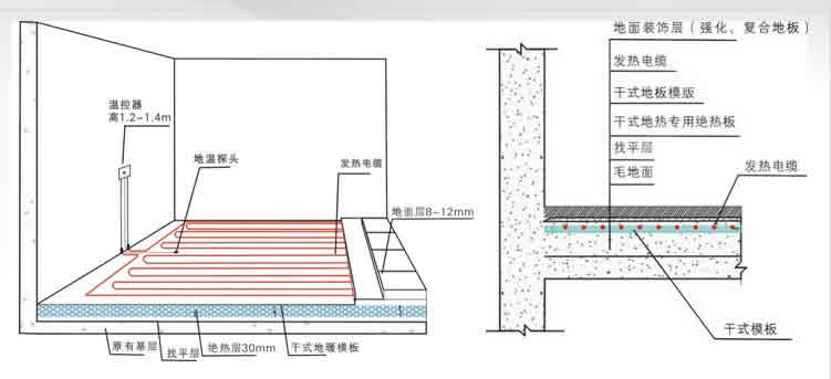 暖線安裝在一般標準的混凝土層中,無需特殊材料;炷翆右话阈3cm厚。如需安裝厚度低,可使用特別的膠粘劑,僅蓋住暖線。這種特別的膠粘劑要求良好的伸縮性。